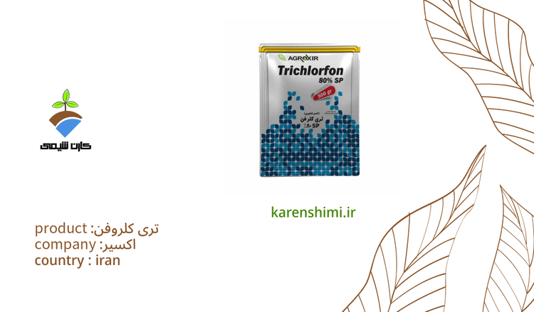 این حشره کش غیرسیستمیک با اثر تماسی و گوارشی می باشد. این سم از گروه فسفره آلی (ارگانو فسفره) است. این حشره کش با نام تجاری دیپترکس و فرمولاسیون های (EC 50%)، (WP 80%)، (SP 80%) و (P 96%) در بازار تولید می شود. این سم حشره کش عصبی بوده که با مهار آنزیم کولین استراز سبب مرگ حشرات می شود. افرادی که بر اساس توصیه پزشکی از کار کردن با ترکیبات ضد کولین استراز منع شده اند نباید از این حشره کش استفاده کنند. دوره کارنس تری کلروفن ۷ روز می باشد. این حشره کش در بسته بندی نیم و یک کیلویی از شرکت آریا شیمی در بازار موجود می باشد.